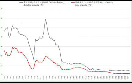 美国长期的贸易保护和孤立主义政策,直到两次世界大战之后的上世纪中叶才逐渐式微,其原因并不是美国人突然开始醒悟,而是由于美国已经开始取代英国成为最大的工业出口国,商业利益驱动他们接过起源于英国的自由贸易旗帜,在全世界推销美国产品。战后,美国积极推动多边贸易体系,敦促它国开放市场。美国主导的关贸总协定以及后来的世贸组织(WTO),构成了本轮全球化的制度基石。战后美国贸易政策的转变,也使得美国自身的实际关税水平显著下降(图1)。