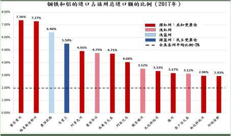 反思特朗普之前对钢铁和铝制品加收关税的计划,从最初声称全球性无差别关税,到逐步扩大豁免国范围,特朗普正在通过强硬态度和灵活策略在贸易谈判中争夺更大利益。在此过程中,民意支持是关键考虑因素。如果真如特朗普最初声称的那样,提高进口关税对那些钢铁和铝制品进口依赖较高的州份而言是很不利的,而这些州大部分都是共和党的票仓(图2)。就以这点来看,特朗普的“高高举起、轻轻放下”就不太难理解了。