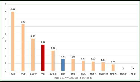 事实上,中国的对外开放还有很大的改善空间。中国的贸易开放程度虽然已有巨大的进步,但从加权平均实际关税水平来看,仍与世界主要经济体存在一定的差距(图4)。
