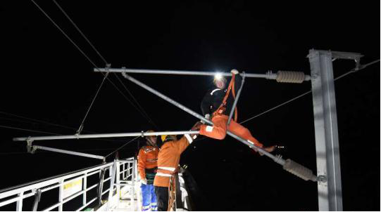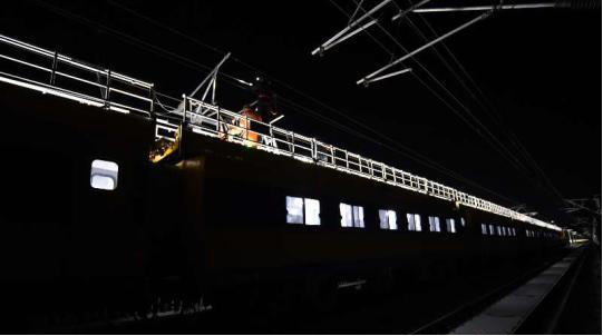 该作业列车顶部作业平台面积近400平方米,是一个宛如巨型“跑道”的超大移动平台,能够容纳近百人同时检修作业,与以往传统的车梯作业相比,检修列的作业平台面积扩大了200倍,比检修作业车扩大了45倍,一次起停车可对175米长的接触网进行集中检修,检修作业效率提高近10倍。