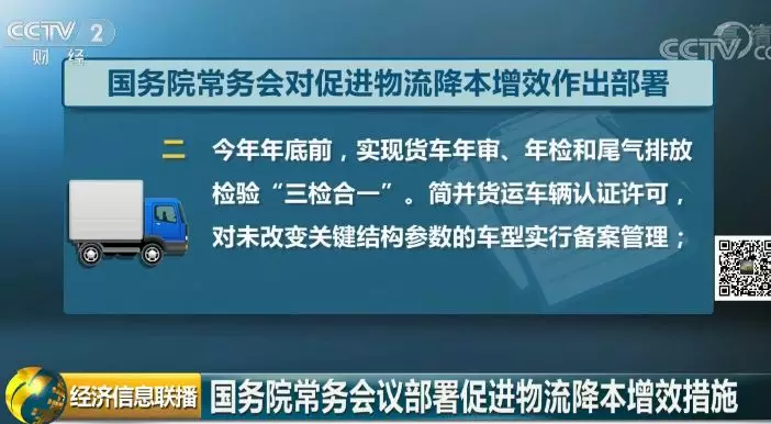 二是今年底前,实现货车年审、年检和尾气排放检验“三检合一”。简并货运车辆认证许可,对未改变关键结构参数的车型实行备案管理;