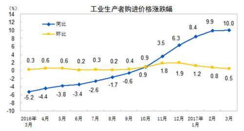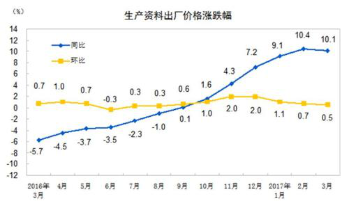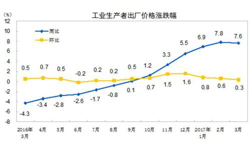 4月12日电 据统计局网站消息,2017年3月份,全国工业生产者出厂价格同比上涨7.6%,环比上涨0.3%。工业生产者购进价格同比上涨10.0%,环比上涨0.5%。一季度,工业生产者出厂价格同比上涨7.4%,工业生产者购进价格同比上涨9.4%。