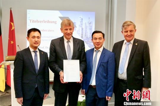 中国国际投资促进中心(德国)主任徐遥君5月29日在法兰克福代表中国商务部投资促进事务局局长刘殿勋,向“隐形冠军”概念的提出者、德国著名管理学者赫尔曼·西蒙教授颁发证书,聘请西蒙为中国国际投资促进中心(德国)荣誉顾问。中国驻法兰克福总领馆经商室参赞朱伟革和20多位中德两国经济界人士一起参加了颁发仪式。