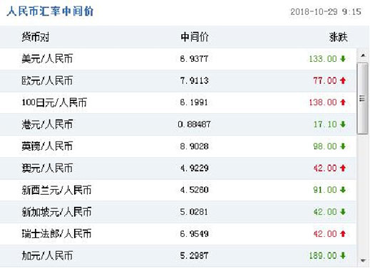 中国外汇交易中心29日公布数据,人民币中间价报6.9377,上调133点,结束四连贬;上一交易日中间价报6.9510,官方收盘价报6.9478,夜盘收盘报6.9450。