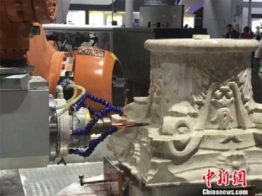 在中国科学馆专馆,一个大型的机械臂模拟人类雕塑家,一边注水,一边用钻头,通过7个不同的角度,在大理石上雕刻出细致花纹。广州中国科学院先进技术研究所相关负责人介绍,该雕刻系统设有废渣、废水收集和过滤回收系统,此外,采用全封设计进行人机隔离,达到安全和环保的效果。