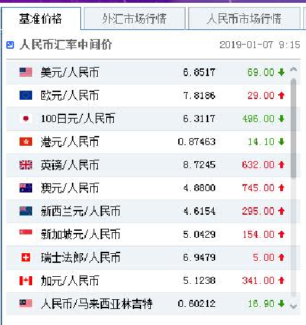 中国人民银行授权中国外汇交易中心公布,2019年1月7日银行间外汇市场人民币汇率中间价为:1美元对人民币6.8517元,1欧元对人民币 7.8186元,100日元对人民币6.3117元,1港元对人民币0.87463元,1英镑对人民币8.7245元,1澳大利亚元对人民币4.8800 元,1新西兰元对人民币4.6154元,1新加坡元对人民币5.0429元,1瑞士法郎对人民币6.9479元,1加拿大元对人民币5.1238元,人民币1元对0.60212马来西亚林吉特,人民币1元对9.9084俄罗斯卢布,人民币1元对2.0398南非兰特,人民币1元对162.89韩元,人民币 1元对0.53610阿联酋迪拉姆,人民币1元对0.54745沙特里亚尔,人民币1元对41.0489匈牙利福林,人民币1元对0.54913波兰兹罗提,人民币1元对0.9554丹麦克朗,人民币1元对1.3062瑞典克朗,人民币1元对1.2561挪威克朗,人民币1元对0.77785土耳其里拉,人民币1元对2.8316墨西哥比索,人民币1元对4.6669泰铢。