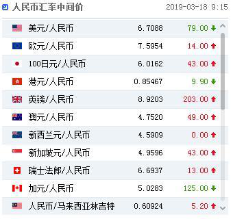 中国人民银行授权中国外汇交易中心公布,2019年3月18日银行间外汇市场人民币汇率中间价为:1美元对人民币6.7088元,1欧元对人民币7.5954元,100日元对人民币6.0162元,1港元对人民币0.85467元,1英镑对人民币8.9203元,1澳大利亚元对人民币4.7520元,1新西兰元对人民币4.5909元,1新加坡元对人民币4.9596元,1瑞士法郎对人民币6.6937元,1加拿大元对人民币5.0283元,人民币1元对0.60924马来西亚林吉特,人民币1元对9.6590俄罗斯卢布,人民币1元对2.1510南非兰特,人民币1元对169.17韩元,人民币1元对0.54749阿联酋迪拉姆,人民币1元对0.55901沙特里亚尔,人民币1元对41.3931匈牙利福林,人民币1元对0.56612波兰兹罗提,人民币1元对0.9826丹麦克朗,人民币1元对1.3768瑞典克朗,人民币1元对1.2721挪威克朗,人民币1元对0.81227土耳其里拉,人民币1元对2.8645墨西哥比索,人民币1元对4.7220泰铢。
