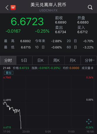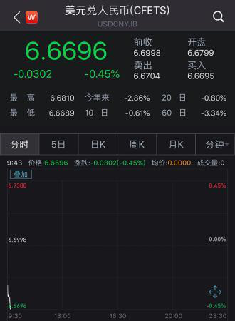 在代表市场预期的即期市场上,人民币对美元以6.6799开盘,较前一交易日6.6998的收盘价大涨近200个基点,随后升破6.68关口,最高升至6.6689。