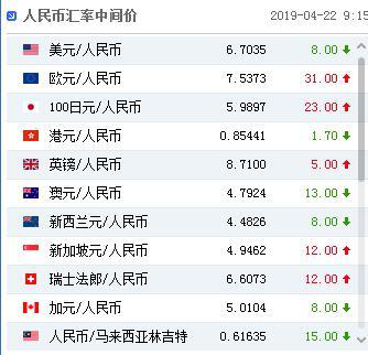 中国人民银行授权中国外汇交易中心公布,2019年4月22日银行间外汇市场人民币汇率中间价为:1美元对人民币6.7035元,1欧元对人民币7.5373元,100日元对人民币5.9897元,1港元对人民币0.85441元,1英镑对人民币8.7100元,1澳大利亚元对人民币4.7924元,1新西兰元对人民币4.4826元,1新加坡元对人民币4.9462元,1瑞士法郎对人民币6.6073元,1加拿大元对人民币5.0104元,人民币1元对0.61635马来西亚林吉特,人民币1元对9.5506俄罗斯卢布,人民币1元对2.0984南非兰特,人民币1元对169.68韩元,人民币1元对0.54791阿联酋迪拉姆,人民币1元对0.55941沙特里亚尔,人民币1元对42.4538匈牙利福林,人民币1元对0.56763波兰兹罗提,人民币1元对0.9905丹麦克朗,人民币1元对1.3886瑞典克朗,人民币1元对1.2706挪威克朗,人民币1元对0.86900土耳其里拉,人民币1元对2.8007墨西哥比索,人民币1元对4.7469泰铢。