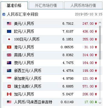 中国人民银行授权中国外汇交易中心公布,2019年5月10日银行间外 汇市场人民币汇率中间价为:1美元对人民币6.7912元,1欧元对人民币7.6187元,100日元对人民币6.1851元,1港元对人民币 0.86535元,1英镑对人民币8.8362元,1澳大利亚元对人民币4.7475元,1新西兰元对人民币4.4754元,1新加坡元对人民币 4.9798元,1瑞士法郎对人民币6.6885元,1加拿大元对人民币5.0437元,人民币1元对0.61149马来西亚林吉特,人民币1元对 9.5657俄罗斯卢布,人民币1元对2.1112南非兰特,人民币1元对173.50韩元,人民币1元对0.54088阿联酋迪拉姆,人民币1元对 0.55227沙特里亚尔,人民币1元对42.5271匈牙利福林,人民币1元对0.56402波兰兹罗提,人民币1元对0.9798丹麦克朗,人民币1 元对1.4208瑞典克朗,人民币1元对1.2928挪威克朗,人民币1元对0.90673土耳其里拉,人民币1元对2.8296墨西哥比索,人民币1元 对4.6749泰铢。