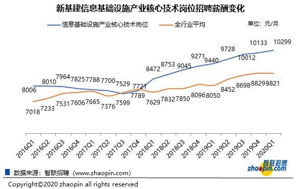2020年一季度,信息基础设施产业核心技术岗位的平均招聘薪酬为10299元/月,比全行业平均(8821元/月)高16.75%,岗位的薪资待遇与其技术含量基本正相关。