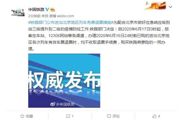 中国国家铁路集团有限公司17日表示,为配合北京市做好应急响应级别由三级提升到二级的疫情防控工作,铁路部门决定:自2020年6月17日0时起,旅客在车站、12306网站等各渠道,办理2020年6月16日24时前已购的进出北京地区各次列车有效车票退票时,均不收取退票手续费,购买铁路乘意险的一同办理。
