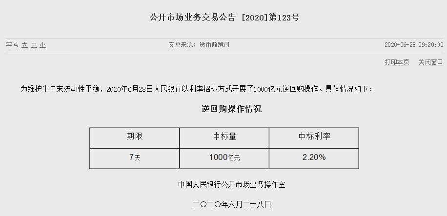 央行早间公告称,为维护半年末流动性平稳,28日公开市场开展1000亿元逆回购操作,期限为7天,中标利率2.20%,较上次维持不变。数据显示,今日1200亿元逆回购到期,单日净回笼200亿元。