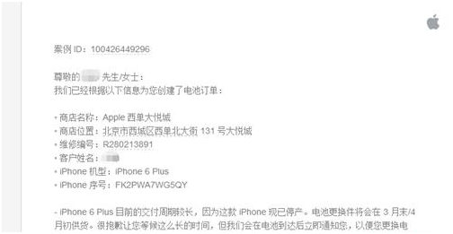但近来,李女士对记者反映,根本就没有电池,电池现在为缺货状态。李女士给提供的资料显示,苹果售后邮件内容显示“iPhone 6 Plus目前的交付周期较长,因为这款iPhone已经停产,电池更换件将在3月末或4月初供货”。