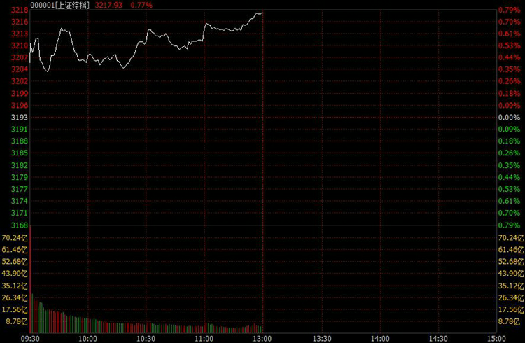 截至午间收盘,沪指报3271.93点,涨幅0.77%,成交1174亿元;深成指报10782.85点,涨幅1.03%,成交1539亿元;创业板指报1869.20点,涨幅1.77%,成交537亿元。
