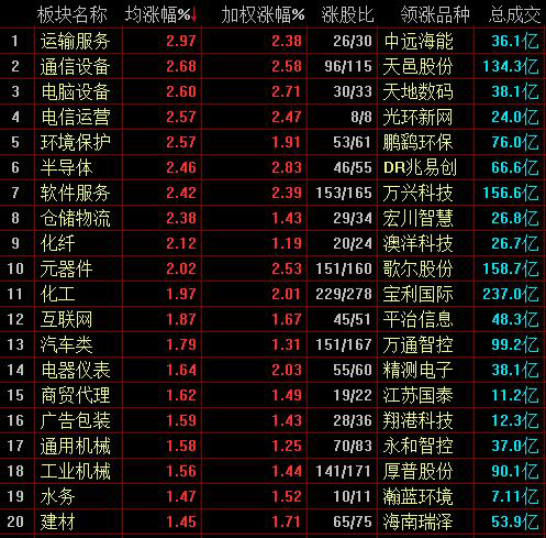 行业板块方面,通信设备、港口航运、环保、物流、钢铁、券商等板块涨幅居前;医药、煤炭、农业、酿酒、银行等板块涨幅相对较窄。