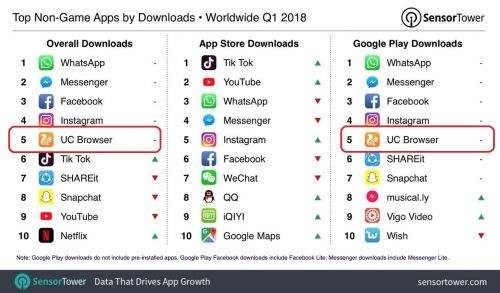 今年5月,第三方应用市场研究公司Sensor Tower的数据显示,统计今年一季度苹果和谷歌两大应用商店的全球下载量,来自中国的移动应用UC浏览器跻身前十榜单,排名第5,超过Snapchat、YouTube和Netflix等国际知名应用。UC浏览器作为中国老牌互联网产品,在已经拥有超6亿季活用户的基础上,下载量的增加主要得益于其在海外市场的发力,尤其是在还处于处于移动互联网高速发展阶段的南亚和东南亚市场。《华尔街日报》此前曾报道称,阿里旗下的UC浏览器在亚洲新兴市场表现抢眼,占据了明显优势,并超越了谷歌Chrome浏览器。