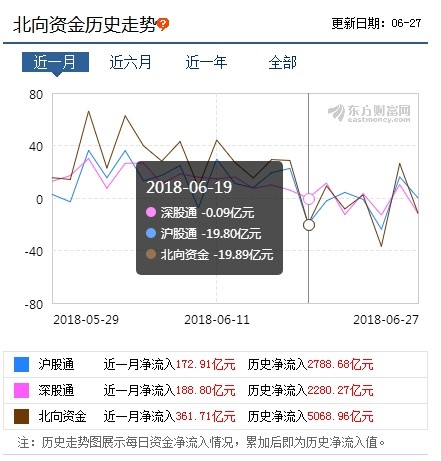 今年以来持续增持A股的北向资金,近两周开始出现“撤退”的迹象。据中信建投统计,上周(6.18-6.24),北向资金净流出21.57亿元,而中新经纬客户端梳理东方财富数据发现,截至本周三,本周(6.25-6.27)北向资金已经净流出了22.11亿元。也就是说近两周来,北向资金总共流出了43.68亿元。