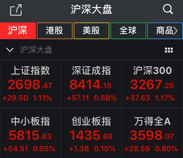 截至收盘,沪指报2689.47点,涨1.11%,成交1140亿元;深成指报8414.15点,涨0.68%,成交1507亿元;创业板指报1435.69点,涨0.10%,成交494亿元。