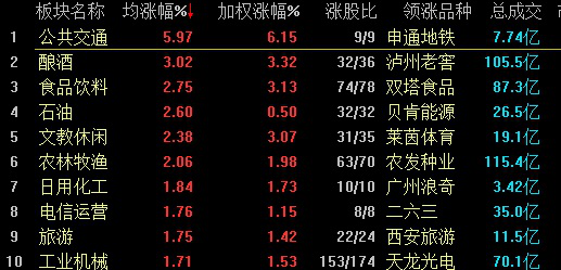 盘面上,行业板块近乎全红,公共交通、食品饮料、石油、酿酒、文教休闲、农林牧渔等板块涨幅居前;仅航空、船舶两板块下跌。
