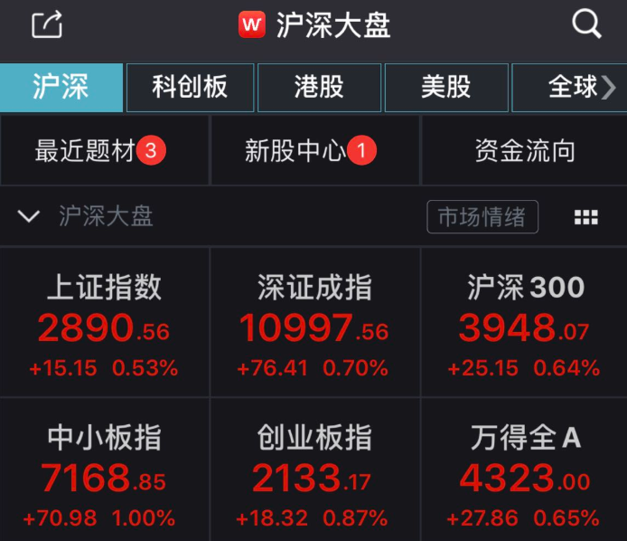 截至11:30,沪指报2890.56点,涨幅0.53%,成交量1479.45亿元;深成指报10997.56点,涨幅0.7%,成交量2258.92亿元;创业板指报2133.17点,涨幅0.87%。沪股通净流入10.7亿,深股通净流入14.7亿。