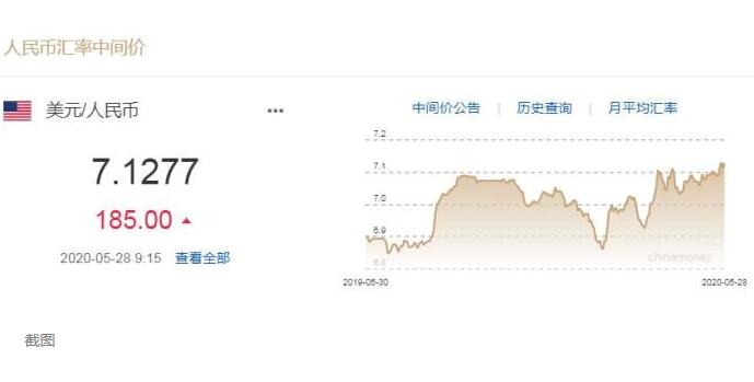 据中国外汇交易中心网站消息,5月28日人民币兑美元汇率中间价报7.1277元,下调185个基点。