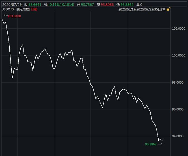 3月的103.9到5月的100,再到6月的97,如今美元指数再下台阶,跌破93.5,于7月29日触及93.45,刷新2018年6月以来的最低水平。