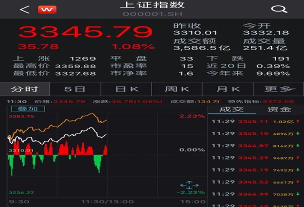 截至午间收盘,沪指报3345.79点,涨1.08%,成交3586亿元;深成指报13859.30点,涨1.62%,成交4815亿元;创业板指报2847.00点,涨1.85%,成交1710亿元。