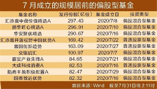 7月以来,由胡昕炜担纲基金经理的汇添富中盘价值精选混合首发全天获得近700亿元资金认购,由王宗合担纲的鹏华匠心精选混合基金首日更是吸金逾1300亿元。还有华安聚优精选、汇添富开放视野中国优势、富国创新趋势等多只爆款基金,6只科创板基金也一天吸金150亿元……
