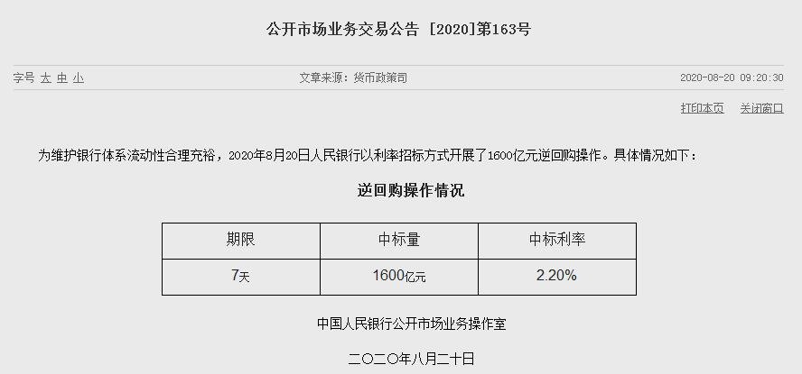 据央行网站20日消息,央行公告称,为维护银行体系流动性合理充裕,8月20日人民银行以利率招标方式开展了1600亿元逆回购操作,中标利率为2.20%。
