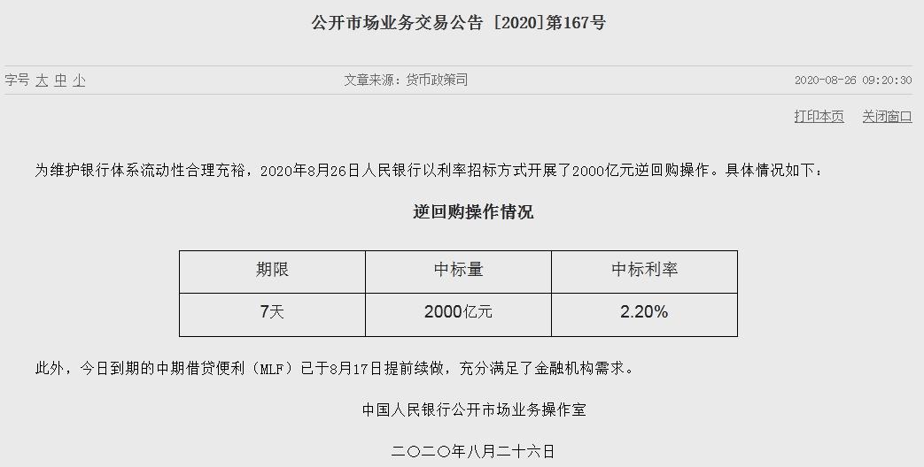 据央行网站公告,为维护银行体系流动性合理充裕,8月26日人民银行以利率招标方式开展了2000亿元7天期逆回购操作。