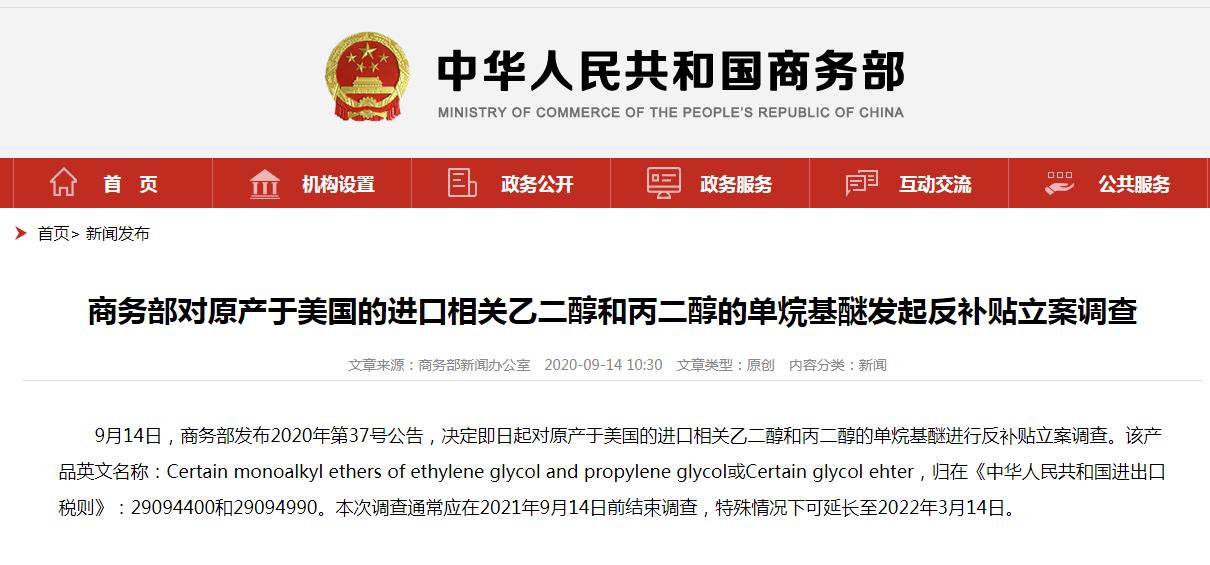 据商务部网站消息,9月14日,商务部发布2020年第37号公告,决定即日起对原产于美国的进口相关乙二醇和丙二醇的单烷基醚进行反补贴立案调查。
