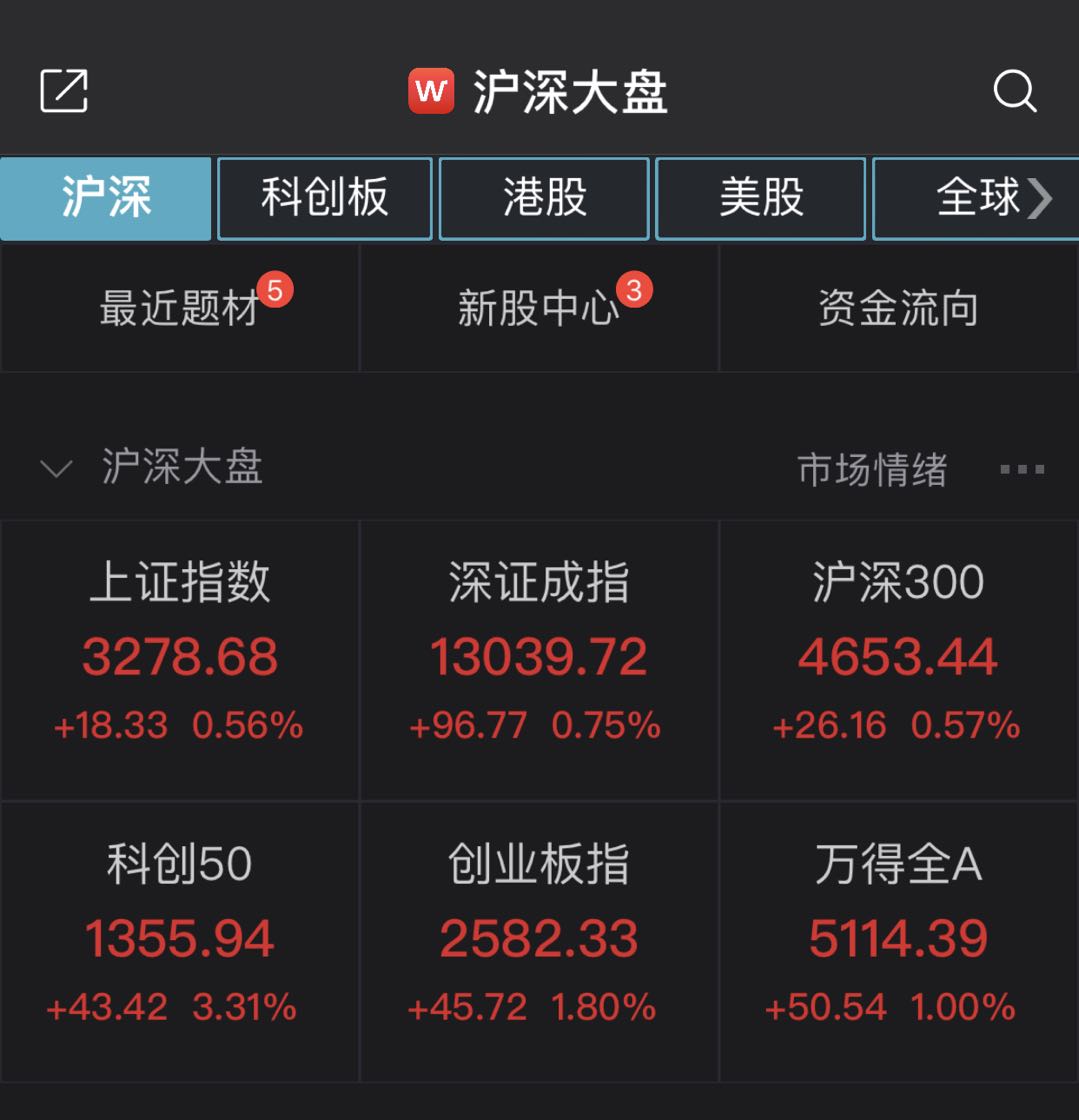 截至午间收盘,沪指报3278.68点,涨幅0.56%,成交额1690.25亿元;深成指报13039.72点,涨幅0.75%,成交额3177.56亿元;创业板指报2582.33点,涨幅1.8%;上证50指数报3293.96点,涨幅0.87%。