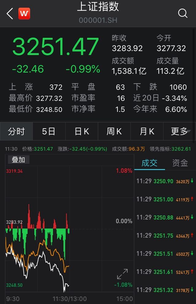 截至午间收盘,沪指报3251.47点,跌幅0.99%,成交额1538.1亿元;深成指报12885.25点,跌幅0.97%,成交额2688.18亿元;创业板指报2526.81点,跌幅1.1%;上证50指数报3255.63点,跌幅1.21%。