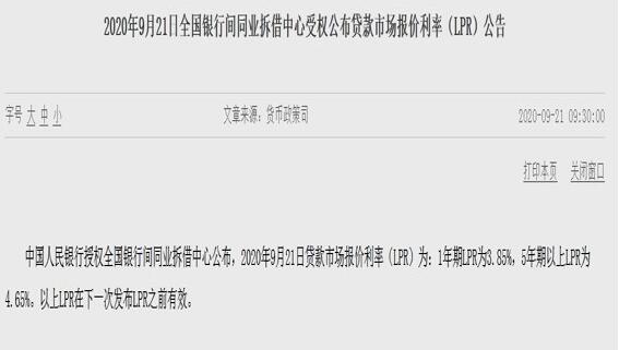 21日,中国人民银行授权全国银行间同业拆借中心公布的贷款市场报价利率(LPR)显示,一年期LPR为3.85%;五年期以上LPR为4.65%,与8月报价保持不变。