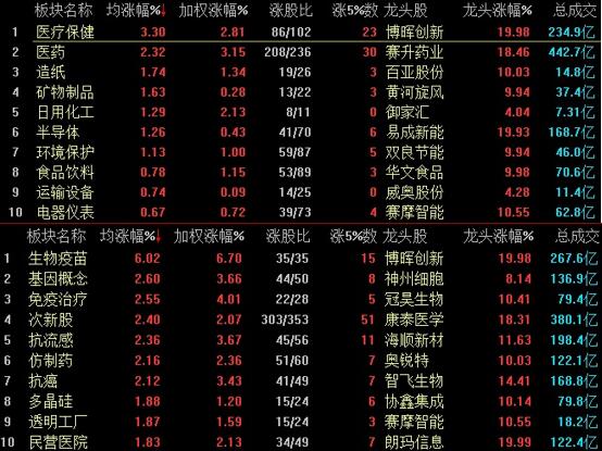 概念板块普涨,生物疫苗、基因概念、免疫治疗、次新股、抗流感、仿制药等板块涨幅靠前;数字货币、种业、电子支付、生态农业、赛马概念、量子通信等板块跌幅靠前。