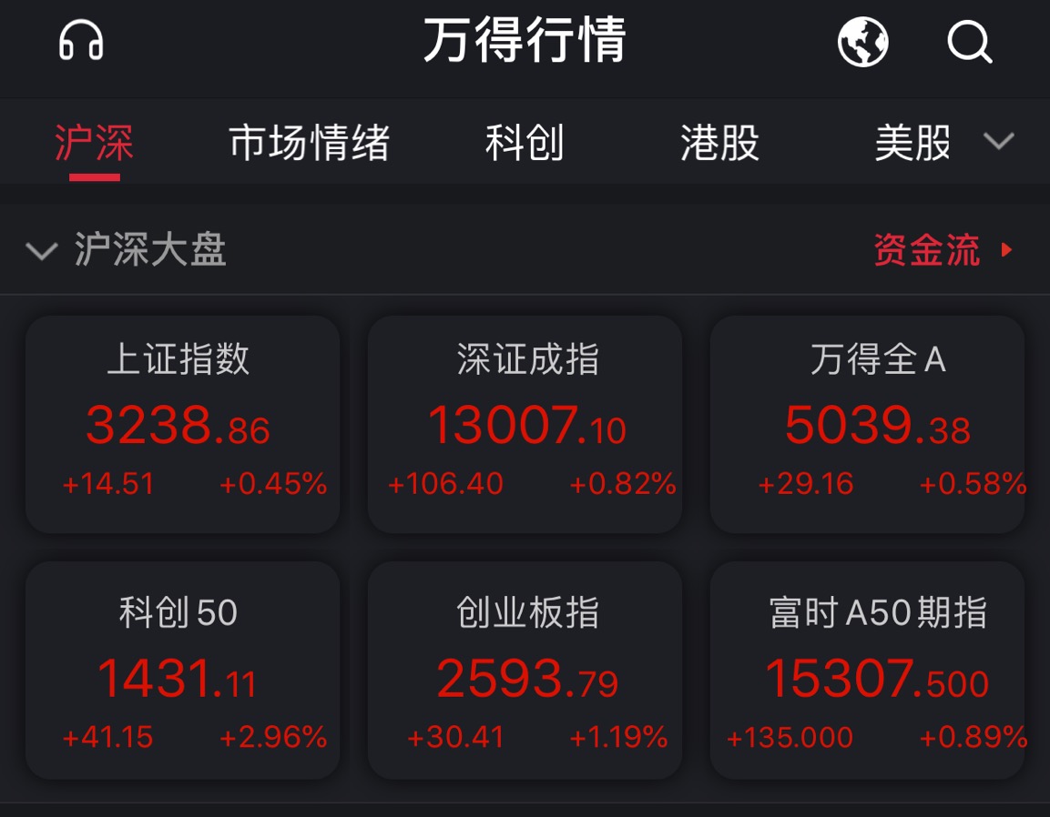截至午间收盘,沪指报3238.86点,涨幅0.45%,成交额1068.68亿元;深成指报13007.10点,涨幅0.82%,成交额1858.93亿元;创业板指报2593.79点,涨幅1.19%;上证50指数报3257.45点,涨幅0.5%。