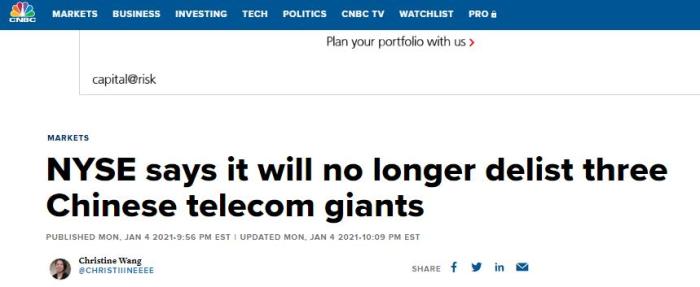 2020年12月31日,美国纽约证券交易所曾发布声明,称为遵守特朗普政府禁止美国人投资“有军方背景的中国企业”的行政令,将对中国联通(香港)、中国移动和中国电信等三家中国公司进行退市处理。