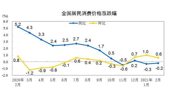国家统计局3月10日公布数据显示,2021年2月份,全国居民消费价格(CPI)同比下降0.2%,降幅比上月收窄0.1个百分点,连续两个月处于负值。为何会这样?