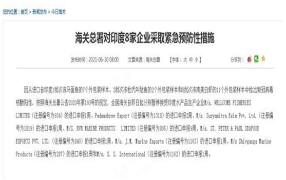 因从进口自印度1批次冻马面鱼的7个外包装样本、2批次冻杜氏叫姑鱼的2个外包装样本和8批次冻南美白虾的11个外包装样本中检出新冠病毒核酸阳性,按照海关总署公告2020年第103号的规定,全国海关自即日起分别暂停接受印度水产品生产企业M/s. WELLCOME FISHERIES LIMITED(注册编号为934)的进口申报1周、Padmashree Export(注册编号为1318)的进口申报2周、M/s. Suryamitra Exim Pvt. Ltd。(注册编号为1819)的进口申报1周、M/S. RVR MARINE PRODUCTS LIMITED(注册编号为805)的进口申报9周、M/s. ST. PETER & PAUL SEAFOOD EXPORTS PVT. LTD。(注册编号为840)的进口申报1周、M/s. J.M. Marine Exports(注册编号为1163)的进口申报1周、M/s Shivganga Marine Products(注册编号为287)的进口申报1周和M/s. S. S. International(注册编号为1162)的进口申报1周。