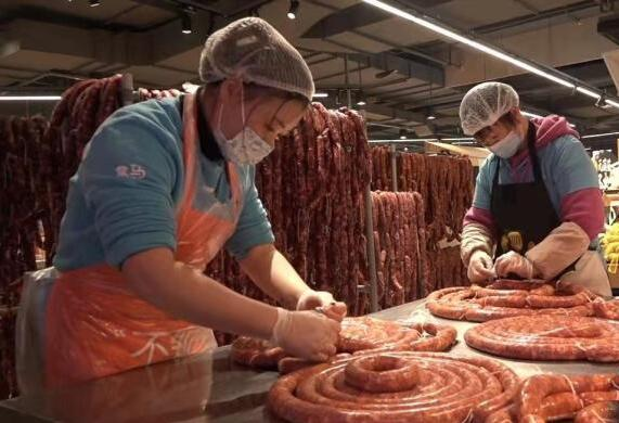 长沙盒马喜盈门店内挂满了香肠,前来询价、现场灌制香肠的民众络绎不绝。在门店香肠灌制区,五位工作人员热火朝天地给五花肉抹满花椒、粗盐,灌制香肠的机器轰轰作响,一旁货架上挂满了油亮的香肠,长达十余米。