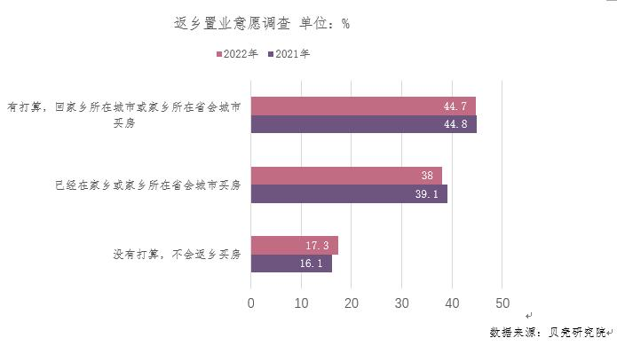 《报告》显示,约44.7%受访客群表示“有打算返乡置业,回家乡所在城市或家乡所在省会城市买房”,与21年相比出现略微下降。同时,有17.3%受访客群表示“没有打算,不会返乡买房”,与21年相比出现略微上涨。总体而言,2022年客群返乡置业意愿出现小幅下降。