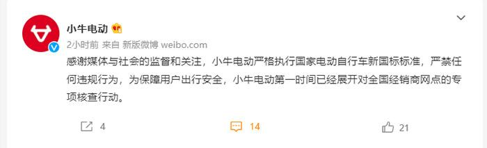 17日,小牛电动发微博称,感谢媒体与社会的监督和关注,小牛电动严格执行国家电动自行车新国标标准,严禁任何违规行为。